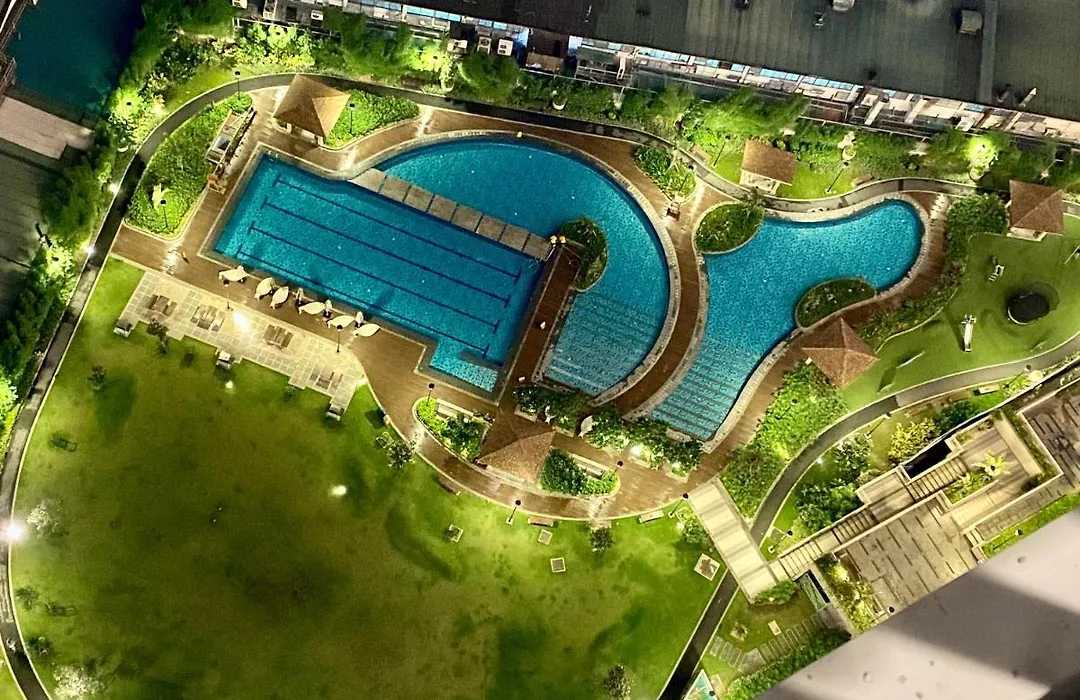 寝室1室のCozy 1 Bedroom Scandinavian/Tropical Condo With Balcony & Parking マニラ市は、イーストウッド・シティから7kmくらいに位置し、プールを提供しています。 38m²のアパートからは庭園の景色を望め、テラスもあります。